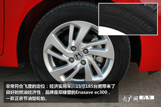 本次試駕車型雖為頂配,但輪胎輪轂選擇非常保守,當(dāng)然這非常符合飛度的定位:經(jīng)濟(jì)實(shí)用車。15寸185臺寬帶來了良好的燃油經(jīng)濟(jì)性,品牌是鄧祿普的Enasave ec300,一款正宗節(jié)油型輪胎。其實(shí)飛度在國內(nèi)是改裝車迷的摯愛,換裝輪胎輪轂玩出個(gè)范兒還是很方便的。