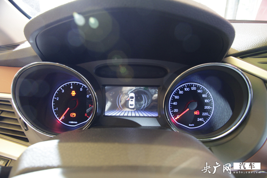 內(nèi)飾方面,比亞迪G5使用了較多軟性材料,棕紅色與灰黑色的雙色搭配也較顯檔次。多功能方向盤上物理按鍵不少,功能也較為豐富,不僅可以調(diào)節(jié)播放系統(tǒng),而且可以對(duì)倒車影像的視角進(jìn)行選擇。另外,該車還裝配了雙炮筒加液晶屏形式的儀表盤和8寸液晶屏幕。