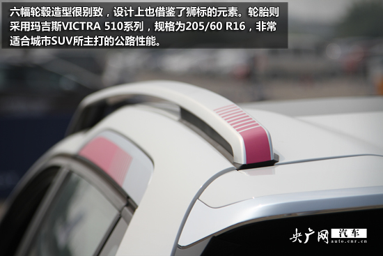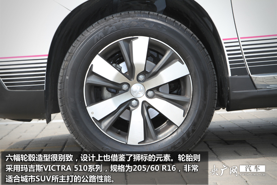 六幅輪轂造型很別致,設(shè)計上也借鑒了獅標(biāo)的元素。輪胎則采用瑪吉斯VICTRA 510系列,規(guī)格為205/60 R16,非常適合城市SUV所主打的公路性能。