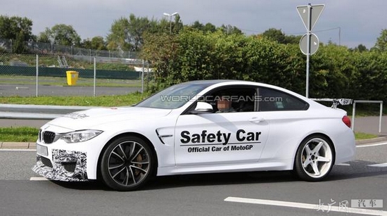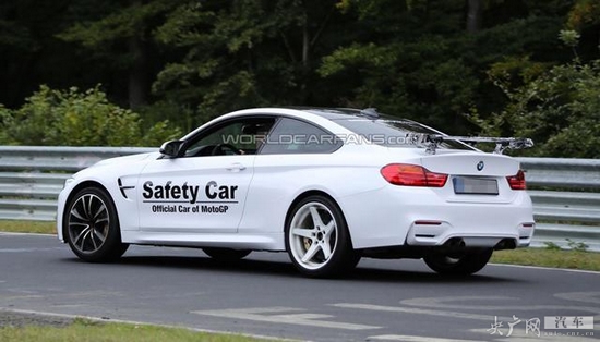 此次曝光的寶馬M4 GTS路試車貼有Moto GP(國際摩托車賽事)安全車的車貼,但我們猜測這款路試車實際上是基于標準版寶馬M4開發(fā)而來的輕量化版本。從諜照看,新車配有更加夸張的前包圍套件以及固定尾翼。