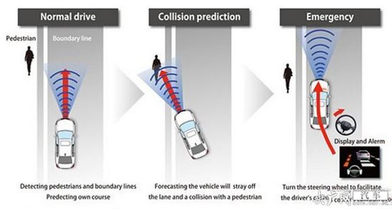 該系統(tǒng)包含以下五種功能: 1.碰撞緩解制動(dòng)系統(tǒng)(Collision Mitigation Braking System)當(dāng)系統(tǒng)檢測(cè)到正面碰撞可能時(shí),碰撞緩解制動(dòng)系統(tǒng)將通過聲音和圖標(biāo)發(fā)出警示。如果駕駛者沒有采取措施避免碰撞,將自動(dòng)施加制動(dòng),避免碰撞或者降低碰撞損失。 2.車道偏離警示系統(tǒng)(Road Departure Mitigation System)車道偏離警示系統(tǒng)利用攝像頭監(jiān)測(cè)車輛是否偏離車道,若偏離車道,方向盤會(huì)出現(xiàn)振動(dòng),并發(fā)出聲音報(bào)警。如果駕駛者沒有采取措施補(bǔ)救,車輛將自動(dòng)施加制動(dòng),防止車輛沖出路面。 3.行人碰撞緩解轉(zhuǎn)向系統(tǒng)(Pedestrian Collision Mitigation Steering System)行人碰撞緩解轉(zhuǎn)向系統(tǒng)利用雷達(dá)和攝像頭監(jiān)測(cè)行人,以及“隔離帶邊界線”。當(dāng)系統(tǒng)檢測(cè)到車輛可能撞到行人或者中間隔離帶時(shí),將自動(dòng)轉(zhuǎn)向避開行人和隔離帶,防止碰撞。 4. 起步防撞功能(False Start Prevention Function)起步防撞能防止因?yàn)槠鸩郊铀龠^快追尾前方車輛。例如在燈光信號(hào)前,該系統(tǒng)能夠自動(dòng)監(jiān)測(cè)前方車輛,通過聲音和圖標(biāo)發(fā)出警示,油門踏板也將出現(xiàn)振動(dòng)。 5.前車起步提醒系統(tǒng)(Lead Car Departure Notification)前車起步提醒系統(tǒng)在交通信號(hào)燈前或者擁堵等狀況下,當(dāng)前方車輛起步時(shí),系統(tǒng)會(huì)通過聲音和圖標(biāo)提醒駕駛者。