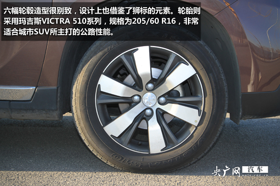 六幅輪轂造型很別致,設(shè)計(jì)上也借鑒了獅標(biāo)的元素。輪胎則采用瑪吉斯VICTRA 510系列,規(guī)格為205/60 R16,非常適合城市SUV所主打的公路性能。行李架的自然要出現(xiàn)在SUV車型上,而東風(fēng)標(biāo)致2008的一大賣點(diǎn)是全系標(biāo)配的全景天窗,雖然這塊天窗不能打開,更準(zhǔn)確的說是一塊全景天幕玻璃,但是相信不少人都希望躺在車?yán)锟葱切,浪漫的法?guó)人正好滿足了這種需求。