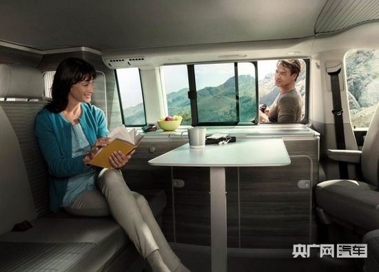 California入門版配備掀蓋式車頂、窗簾、野餐桌、折疊椅,最多承載7名駕乘者。中配版本California Coast在此基礎(chǔ)上增添廚房,提供了不銹鋼水槽、雙火頭燃氣灶和容積42升的冰箱,此外還增添了鋁合金和實木制造的簡單家具。