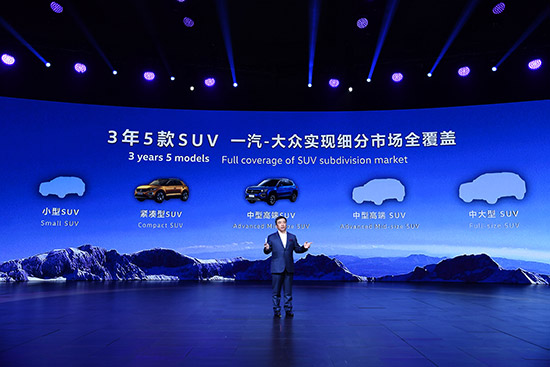 在未來的3年內(nèi),一汽-大眾將會密集推出5款SUV產(chǎn)品,實現(xiàn)從小型、緊湊型、中型到中大型細分市場的全覆蓋,而這將會改觀一汽大眾一直以來存在的“SUV荒”。