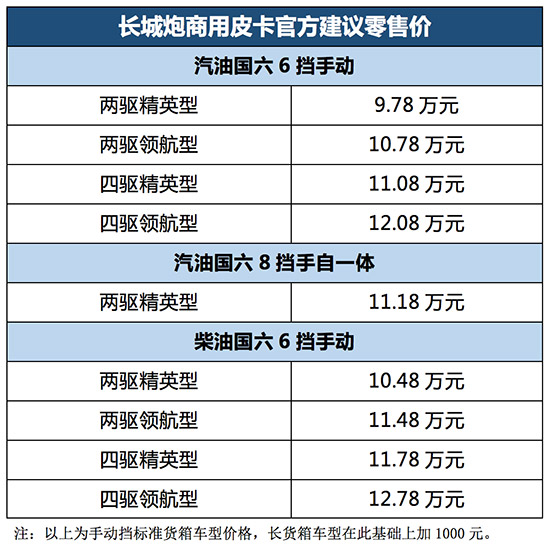 作為商用版的皮卡車型,長城炮為了滿足不同用戶的需求,推出了包括使用汽/柴油發(fā)動機(jī)、8擋手自一體/6擋手動變速器、兩驅(qū)/四驅(qū)、標(biāo)準(zhǔn)貨箱/長貨箱、精英型/領(lǐng)航型共17個版本供消費(fèi)者選擇。對于一臺車身達(dá)到5.6米的大興皮卡車型,低于10萬元的起售價無疑對于消費(fèi)者有著超強(qiáng)的吸引力。