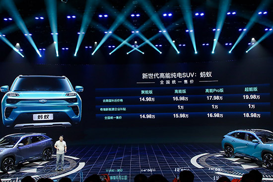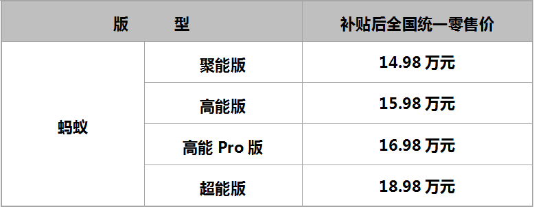 央廣網(wǎng)北京9月23日消息(記者李尚)9月22日,奇瑞新能源全新A級(jí)純電SUV——奇瑞新能源螞蟻在北京正式上市。新車將提供聚能版、高能版、高能Pro版以及超能版四款版型,補(bǔ)貼后售價(jià)14.98萬元起。