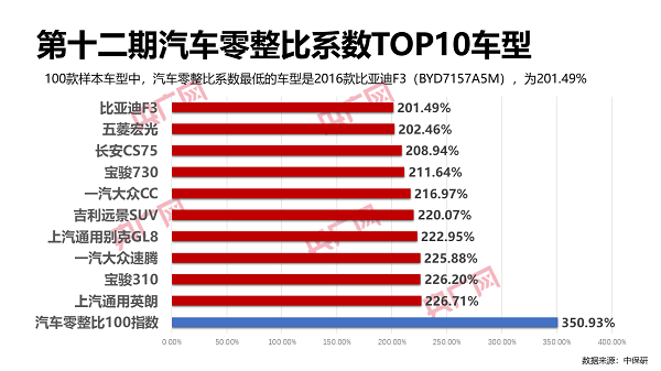 本期汽車零整比系數(shù)樣本車型中最低的五款車型分別是比亞迪F3、五菱宏光、長安CS75、寶駿730和一汽大眾CC。其中,比亞迪F3零整比系數(shù)僅為201.49%,也就是說比亞迪F3所有裝車配件價格加起來與兩輛整車的價格相當。