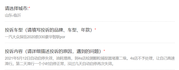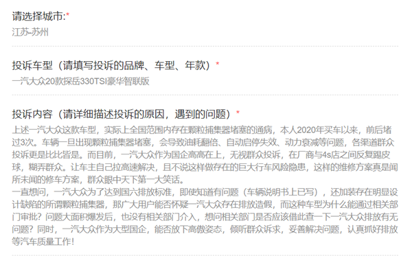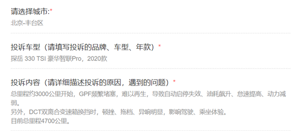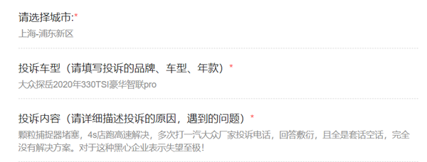 央廣網(wǎng)北京6月15日消息(記者 明艷)近日,央廣網(wǎng)聯(lián)合中國交通廣播并機(jī)音視頻直播欄目“汽車投訴站”接到多名一汽-大眾探岳車主投訴。車主們表示,目前不少一汽-大眾探岳330TSI兩驅(qū)豪華智聯(lián)版、330TSI兩驅(qū)豪華智聯(lián)版Pro兩款車型及部分280TSI兩驅(qū)舒適智聯(lián)版、280TSI兩驅(qū)豪華智聯(lián)版車型遇到了因顆粒捕捉器一至六級(jí)堵塞而帶來的各種問題。對(duì)于車主們的不滿,4S店則表示“是正,F(xiàn)象”,可通過“車間再生”或“跑高速”解決。而廠家方面,尚未就此問題對(duì)車主做出正面回應(yīng)、提供實(shí)質(zhì)性解決方案。