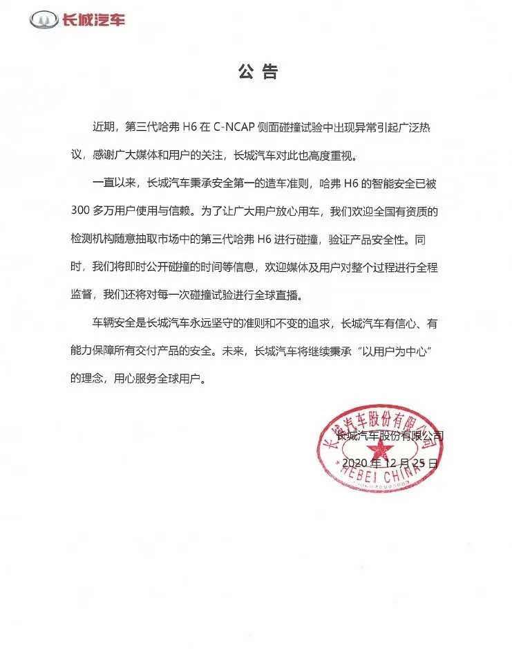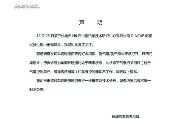 近期,第三代哈弗H6在C-NCAP側(cè)面碰撞的試驗(yàn)中側(cè)氣囊和側(cè)氣簾未彈開引發(fā)廣泛關(guān)注。25日,長(zhǎng)城汽車和哈弗品牌均對(duì)此事作出回應(yīng)。