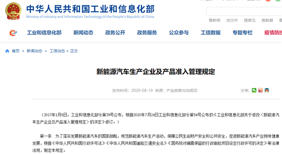 8月19日,工信部正式發(fā)布了修改后的《新能源汽車生產(chǎn)企業(yè)及產(chǎn)品準(zhǔn)入管理規(guī)定》(以下簡稱“規(guī)定”)!兑(guī)定》刪除了包括第五條以及《新能源汽車生產(chǎn)企業(yè)準(zhǔn)入審查要求》等附件中有關(guān)“設(shè)計(jì)開發(fā)能力”的相關(guān)內(nèi)容;將新能源汽車生產(chǎn)企業(yè)停止生產(chǎn)的時間由12個月調(diào)整為24個月;刪除了有關(guān)新能源汽車生產(chǎn)企業(yè)申請準(zhǔn)入的過渡期臨時條款。《決定》將自2020年9月1日起施行。