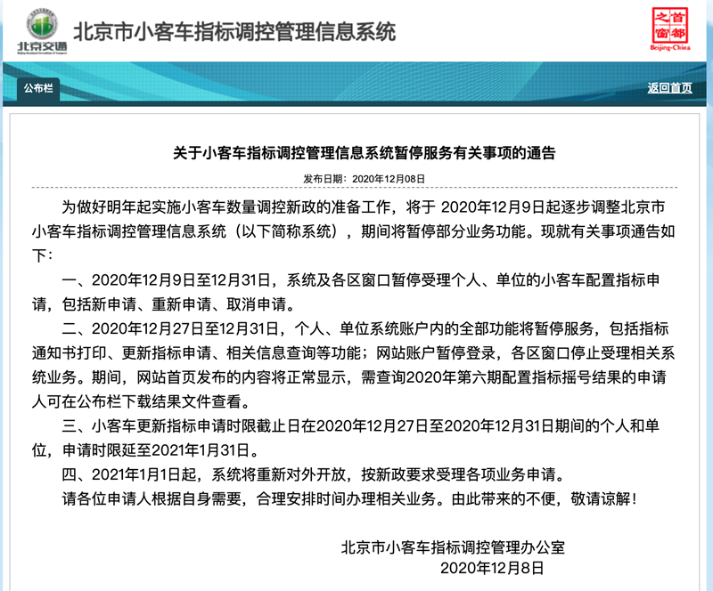 而據(jù)北京市小客車指標(biāo)調(diào)控管理信息系統(tǒng)官網(wǎng)的通知顯示,2020年12月27日至12月31日,個(gè)人、單位系統(tǒng)賬戶內(nèi)的全部功能將暫停服務(wù),包括指標(biāo)通知書打印、更新指標(biāo)申請、相關(guān)信息查詢等功能;網(wǎng)站賬戶暫停登錄,各區(qū)窗口停止受理相關(guān)系統(tǒng)業(yè)務(wù)。