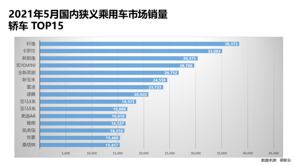 具體車型方面,東風(fēng)日產(chǎn)軒逸銷量達(dá)38,373輛,同比環(huán)比降幅均超過(guò)16%,但依然蟬聯(lián)轎車榜銷量冠軍。豐田卡羅拉5月銷量為35,083輛,取得今年最好成績(jī),同比增長(zhǎng)6%,環(huán)比增長(zhǎng)28%,躍升至排行榜第二名。大眾新朗逸5月銷量依然超過(guò)了3萬(wàn)輛,但同比環(huán)比均再次下降,較之4月下滑了一個(gè)名次。上汽通用五菱宏光MINIEV在5月銷量為29,706輛,為今年前五月最高水平,守住了第四名。