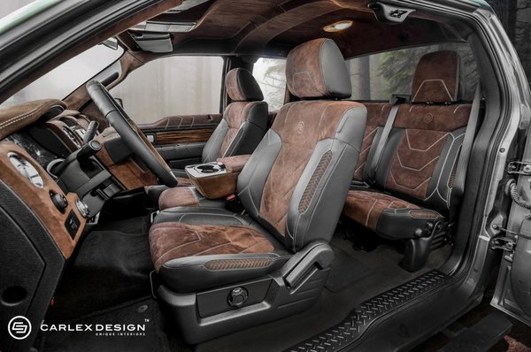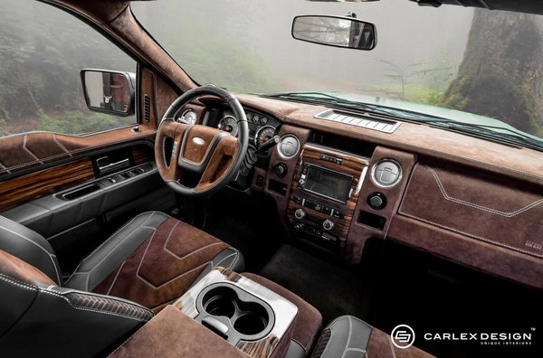 Carlex Design是一家精于內(nèi)飾改裝的設(shè)計公司,日前,他們推出了一款被稱為“獵人版”的福特F-150改裝車型,從圖片就可以看到,他們采用了日產(chǎn)GTR的內(nèi)飾材料,Alcantara面料和真皮搭配,為這款皮卡車打造出超級豪華的內(nèi)飾。