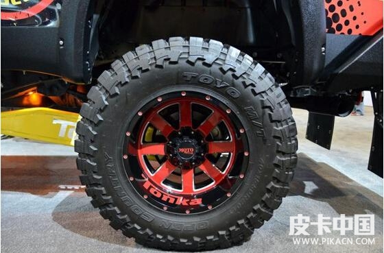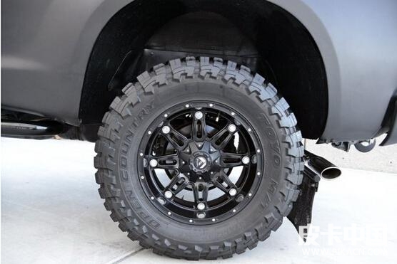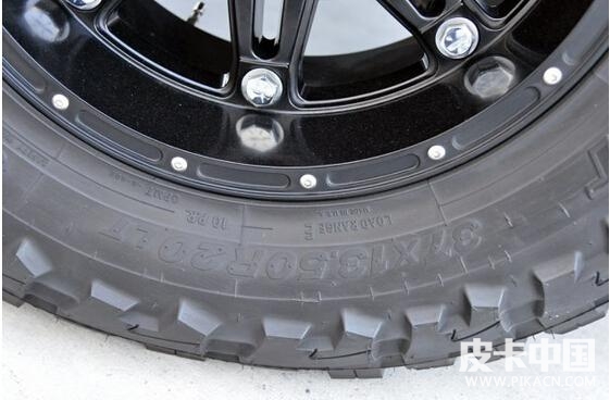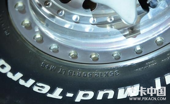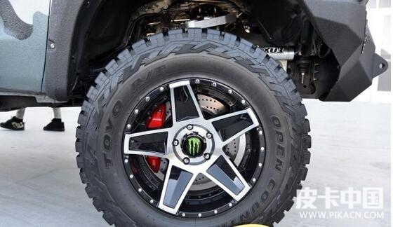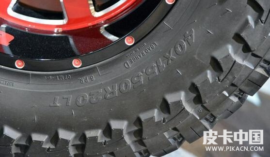 采用toyo open country輪胎,規(guī)格是40X15.50R20 LT。該輪胎是真正的越野型輪胎,是toyo專門為硬派越野suv車型而設(shè)計(jì)的。