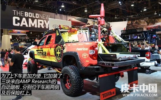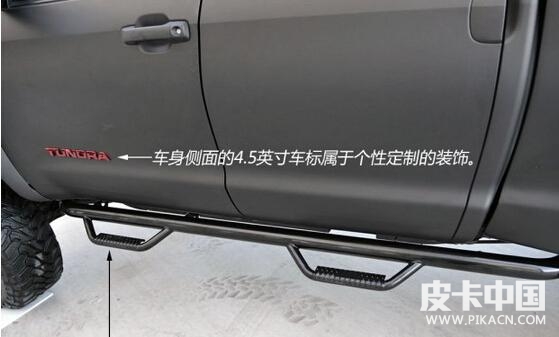 tonka tundra在性能方面也進(jìn)行了大幅度的改動(dòng),它使用的trd性能套件包含了機(jī)械增壓套件、排氣系統(tǒng)、空氣濾清器、機(jī)油蓋以及剎車套件等。為了上下車更加方便,它加裝了三塊來自AMP RESEARCH的自動(dòng)踏板,分別位于車廂兩側(cè)及后保險(xiǎn)杠上。