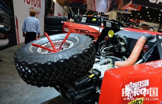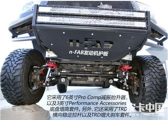 它采用了6英寸PRO COMP減振抬升器,以及3英寸PERFORMANCE ACCESSORIES底盤增高套件。另外,它還采用了TRD橫向穩(wěn)定拉桿和TRD增大剎車套件。