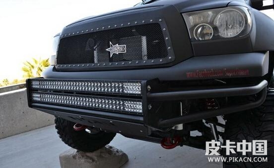 眼前這臺(tái)豐田tundra改裝車同樣是采用了特種車的設(shè)計(jì)風(fēng)格,亞光黑的涂裝搭配上股肉感十足的車身,看上去同樣是“戰(zhàn)斗格”十足。它源自于2007款豐田tundra,外觀和動(dòng)力都經(jīng)過了重度的改裝。