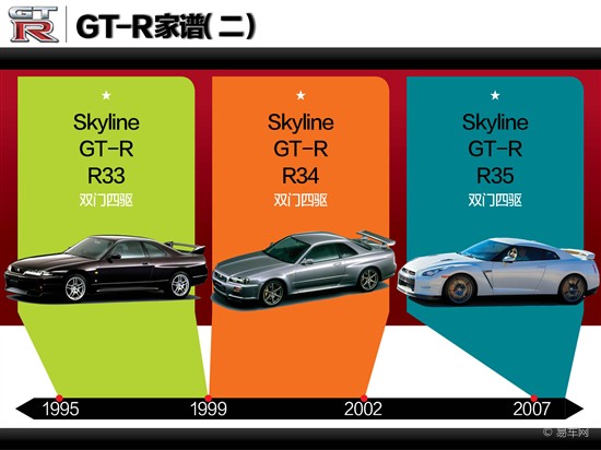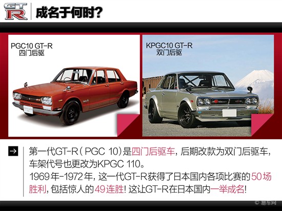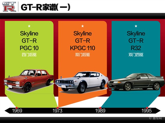 ps:第一代GT-R后期改款為KPGC 10,從四門變?yōu)殡p門。而且R33期間,為紀(jì)念Skyline40周年還推出過四門特別版。