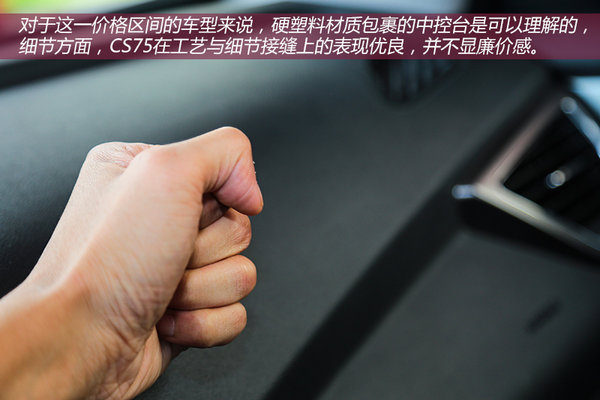 飛翼式的中控臺延續(xù)了CS35的設(shè)計,在細節(jié)上CS75擁有更為時尚的細節(jié)處理,同時為了體現(xiàn)豪華感,做工用料等環(huán)節(jié)也得以再次提升,總體上來講,這款車已脫離了人們對自主品牌的傳統(tǒng)觀念。