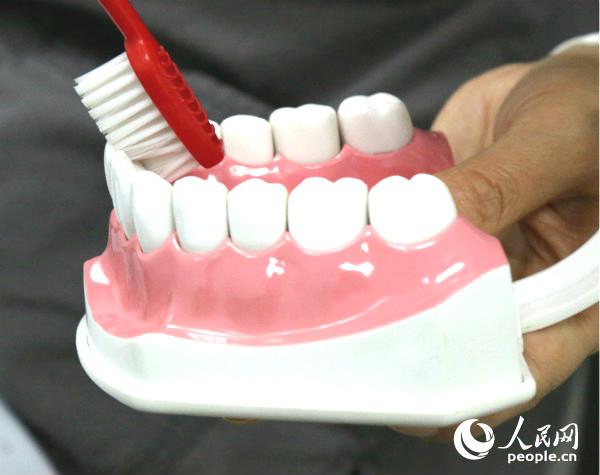 李秀紅說,對于牙周炎患者,因牙縫變大,除了普通牙刷外,牙縫刷在牙齒清潔中也不可或缺。不同規(guī)格的牙縫刷能對不同大小的牙縫進行清潔。(人民網(wǎng)記者張希 攝)