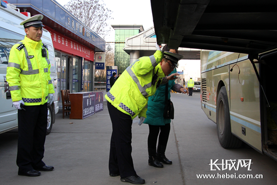 在被譽(yù)為“出京南大門”的涿州北站,一輛輛出京車輛排起了長龍。高速交警涿州大隊(duì)副隊(duì)長張虎向記者介紹,涿州北站是出京進(jìn)入河北的第一站,每天僅七座以上的出京客車流量達(dá)3000余臺(tái),占此站日均出京總量的10%左右。因此涿州北站的春運(yùn)安檢工作任務(wù)艱巨。