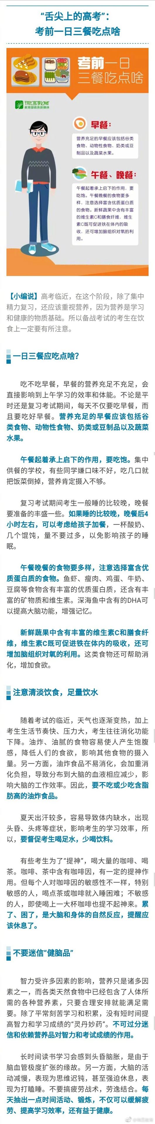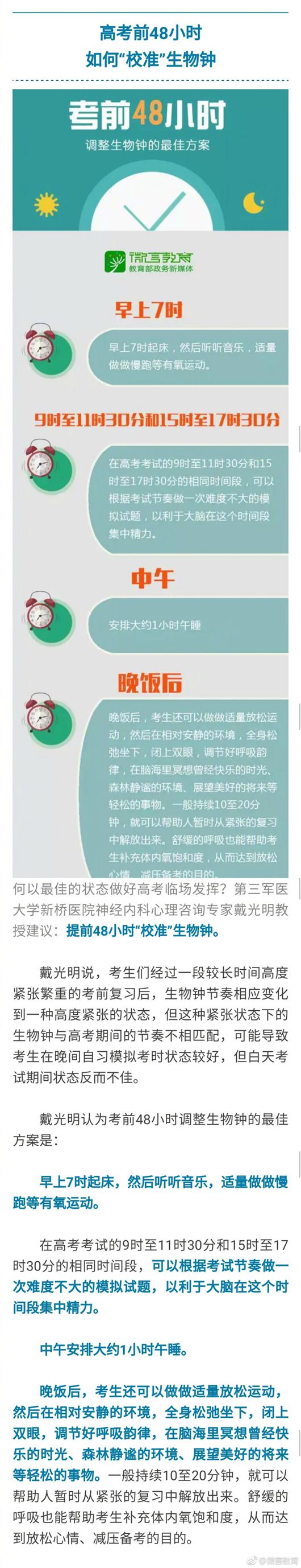 中新網(wǎng)5月26日電 據(jù)教育部新聞辦公室官方微博消息,還有十來天就要高考了,考生們在最關(guān)鍵的沖刺階段如何安排飲食、作息?家長們又該如何做好心理調(diào)節(jié),給孩子們營造一個寬松舒適的情緒環(huán)境,讓考生以最健康的生活狀態(tài)、最輕松的心理狀態(tài)走上考場?詳情戳圖>>