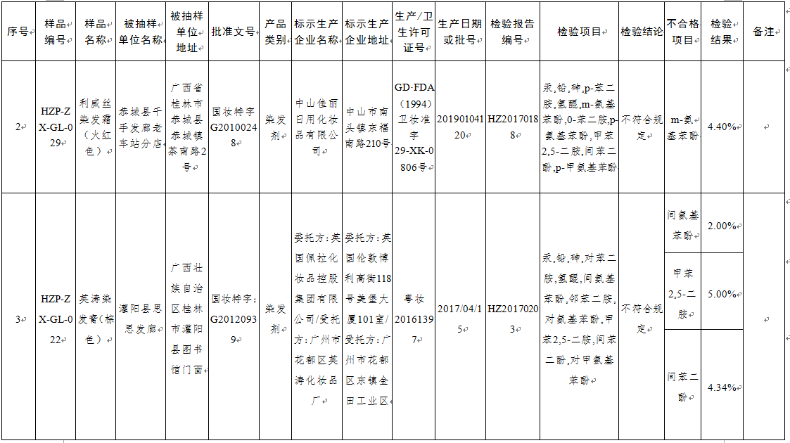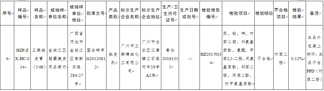 央廣網(wǎng)北京12月18日消息 記者從國(guó)家食藥監(jiān)管理總局官網(wǎng)了解到,為做好廣西化妝品安全監(jiān)督管理工作,規(guī)范化妝品生產(chǎn)經(jīng)營(yíng)市場(chǎng)秩序,根據(jù)《廣西壯族自治區(qū)食品藥品監(jiān)督管理局辦公室關(guān)于印發(fā)2017年廣西化妝品監(jiān)督抽檢工作實(shí)施方案的通知》(桂食藥辦保化〔2017〕7號(hào))和《廣西壯族自治區(qū)食品藥品監(jiān)督管理局辦公室關(guān)于印發(fā)化妝品“顏色行動(dòng)”工作方案的通知》(桂食藥辦保化〔2017〕8號(hào)),廣西壯族自治區(qū)食品藥品監(jiān)督管理局組織開(kāi)展了染發(fā)劑產(chǎn)品專項(xiàng)抽檢。本年度染發(fā)劑產(chǎn)品專項(xiàng)抽檢全區(qū)共抽350批次,其中不合格4批次。
