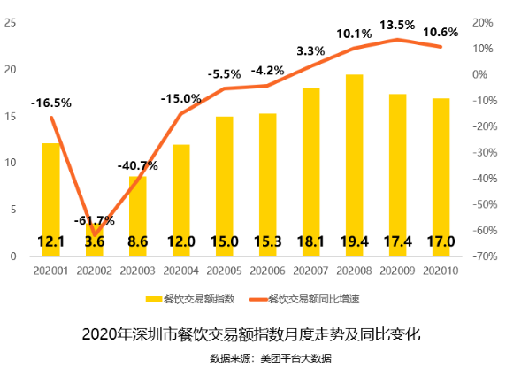 美團《2020年深圳市餐飲消費研究報告》顯示,受疫情影響,今年2月,深圳餐飲交易額出現(xiàn)了61.7%的較大跌幅,但隨后復蘇之勢明顯,尤其是7月以后餐飲交易額增速已經(jīng)轉(zhuǎn)正,總體呈現(xiàn)逐漸向好的趨勢。今年4月至8月,深圳外賣單量位居全國第一,平均每三天左右點一次外賣,點單頻率高,超七成外賣餐飲商戶營業(yè)超過22時。