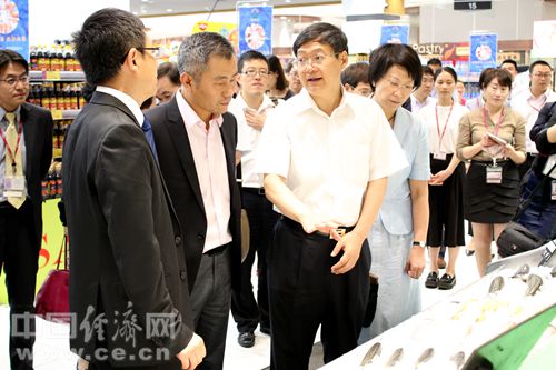 國家食品藥品監(jiān)督管理總局黨組成員、食品安全總監(jiān)郭文奇參觀超市貨架。中國經(jīng)濟(jì)網(wǎng)記者 韓肖/攝