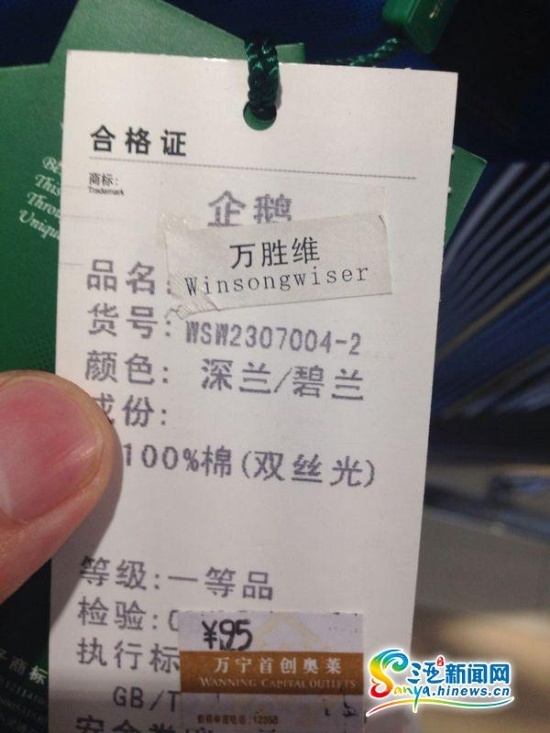 隨后,記者來到了位于奧特萊斯二樓的“萬勝維”男裝專賣店,在這家宣傳特價出售專柜衣服的店內(nèi),T恤接近“白菜價”,58元即可買到一條。售貨員向記者介紹該品牌源自美國,是知名品牌,至于衣服標(biāo)簽上產(chǎn)地寫的中國上海是因為取得了美國公司授權(quán)。記者注意到,該品牌衣服上的標(biāo)簽“萬勝維”是被臨時貼上去的,撕掉之后發(fā)現(xiàn)衣服商標(biāo)卻為“企鵝”,令人不免產(chǎn)生懷疑。記者查詢發(fā)現(xiàn),“萬勝維”官網(wǎng)的介紹存在疑點(diǎn);該品牌的介紹實際是“萬星威”品牌的歷史和文化。為進(jìn)一步核實情況,記者依據(jù)衣服標(biāo)簽上的電話試圖聯(lián)系衣服生產(chǎn)商上海企威服飾有限公司以及“萬勝維”品牌營運(yùn)中心,但所有電話均無法接通,其中一個電話已經(jīng)為別人所用。至此,該公司已變成一家“失聯(lián)”公司。