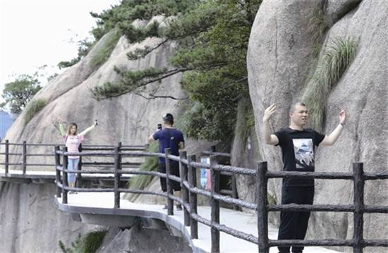 7月14日,游客在九華山花臺(tái)景區(qū)棧道上留影。記者 左澤川 攝