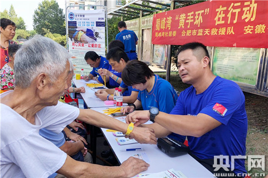 8月30日,合肥蜀峰灣社區(qū)邀請(qǐng)合肥市藍(lán)天救援隊(duì)向轄區(qū)老人免費(fèi)發(fā)放“黃手環(huán)”。