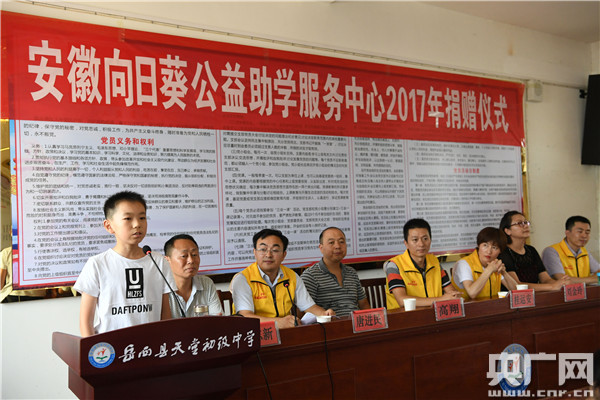 當(dāng)天上午,安徽向日葵公益助學(xué)服務(wù)中心2017年捐贈(zèng)儀式在大別山腹地岳西縣舉行,28名當(dāng)?shù)氐呢毨W(xué)子現(xiàn)場(chǎng)領(lǐng)到了愛(ài)心紅包和圖書、文具、書包等“愛(ài)心禮包”。在此次幫助的28名貧困孩子中,20名由愛(ài)心企業(yè)安徽夏陽(yáng)機(jī)動(dòng)車輛檢測(cè)股份有限公司對(duì)接。