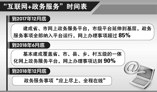 規(guī)劃明確了推進(jìn)“互聯(lián)網(wǎng)+政務(wù)服務(wù)”的“時間表”。到2017年12月底,建成省、市網(wǎng)上政務(wù)服務(wù)平臺,市級平臺延伸到基層,政務(wù)服務(wù)事項全部納入平臺運行,網(wǎng)上辦理事項超過85%,在全省基本實現(xiàn)群眾和企業(yè)辦事“最多跑一次”,努力做到本級公共服務(wù)事項1個工作日、企業(yè)開辦3個工作日、不動產(chǎn)登記證5個工作日、工業(yè)建設(shè)項目施工許可證50個工作日內(nèi)完成審批手續(xù)。到2018年6月底,完成全省政務(wù)服務(wù)事項標(biāo)準(zhǔn)化,基本建成覆蓋省、市、縣、鄉(xiāng)、村五級的一體化網(wǎng)上政務(wù)服務(wù)平臺,網(wǎng)上辦理事項達(dá)到90%。到2018年12月底,政務(wù)服務(wù)事項“應(yīng)上盡上、全程在線”,實行跨部門、跨層級、跨區(qū)域業(yè)務(wù)協(xié)同辦理。