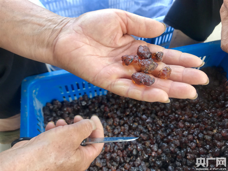 在合作社的小院里,兩個(gè)大娘正對(duì)著兩框琥珀色的結(jié)晶迅速挑揀!边@是我們桃樹(shù)上的結(jié)的桃膠,王康云會(huì)幫我們拿出去賣(mài)掉!坝捎谕寥缐A性較大,獅子崗的桃樹(shù)產(chǎn)出的桃膠也多,王康云總是一家家打電話問(wèn)桃農(nóng)有沒(méi)有桃膠要拿來(lái)賣(mài)。“不收錢(qián)的,他們平時(shí)在這里幫忙做活,雖然我自己不賣(mài)桃膠,但只要留心到了銷(xiāo)路,我就幫著他們賣(mài)。”