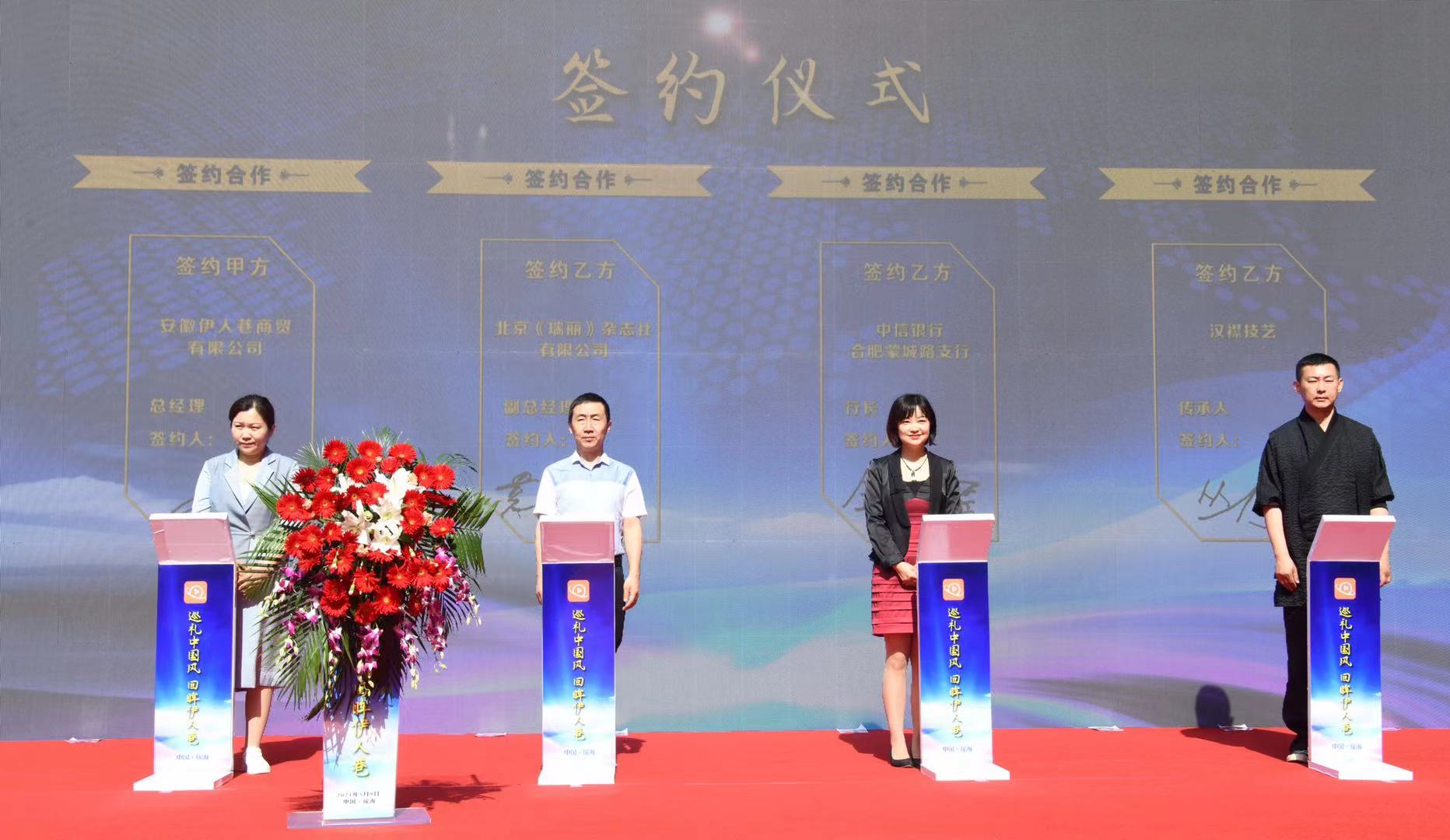 在活動(dòng)現(xiàn)場(chǎng),包括北京《瑞麗》雜志社有限公司、金龍魚合肥總代、迎駕集團(tuán)合肥運(yùn)營(yíng)商、百利食品等14家企業(yè)和非遺文化傳承人與選品中心簽約。
