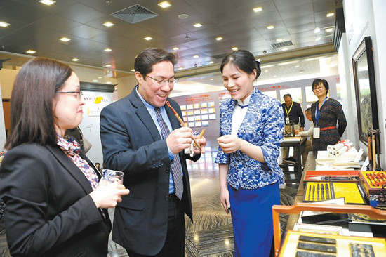 委內(nèi)瑞拉嘉賓饒有興致地拿起宣筆觀賞。