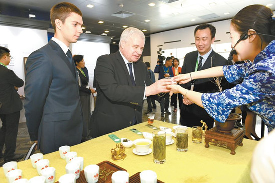 “徽茶仙子”為外國嘉賓捧上一杯杯清香四溢的安徽茶。