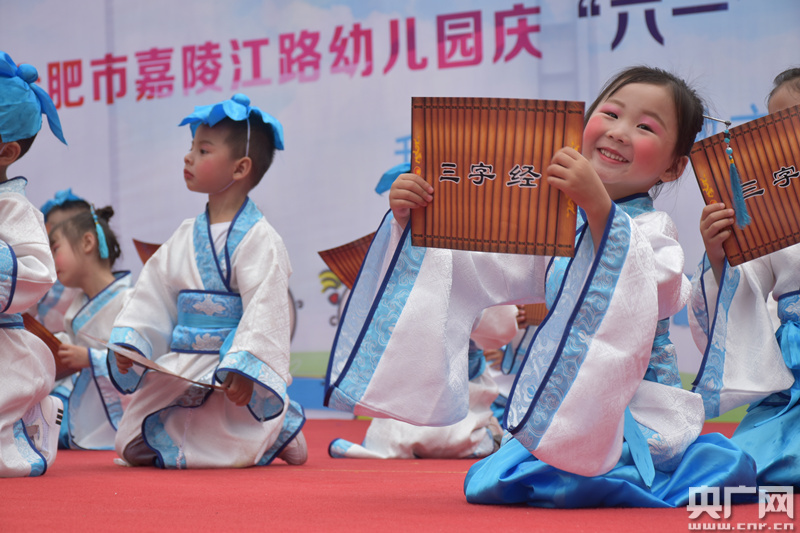 活動現(xiàn)場,來自合肥市嘉陵江路幼兒園的小朋友們,在舞臺上用靈動優(yōu)美的舞蹈慶祝專屬自己的節(jié)日。一個個或化身小蜜蜂,或扮成小書童演繹經(jīng)典舞蹈;場上民族風和現(xiàn)代風穿插,相得益彰。舞臺下,觀眾們歡聲笑語不斷,和孩子們共同歡度六一。(任蘭 攝)