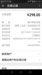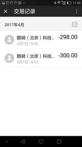昨日中午,徐女士展示了當(dāng)天所用的手機(jī),上面保留了當(dāng)天交易的各種截圖,從截圖上可以看到,在16:33分和16:42分,她分別被扣款300元和298元。該扣款記錄在微信上還有保留信息,在微信交易記錄中顯示,300元(2元為預(yù)繳騎車費(fèi))和298元押金被支付給了酷騎(北京)科技有限公司,顯示狀態(tài)為“支付成功”。