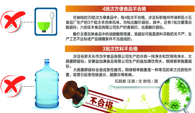 10月19日,安徽省食藥監(jiān)局公布2017年第41期食品安全監(jiān)督抽檢信息,在抽檢的217批次食品樣品中,食用農(nóng)產(chǎn)品和水產(chǎn)制品2類食品全部合格。7批次不合格,涉及方便食品和飲料。目前,食藥監(jiān)部門已責(zé)令下架、召回。