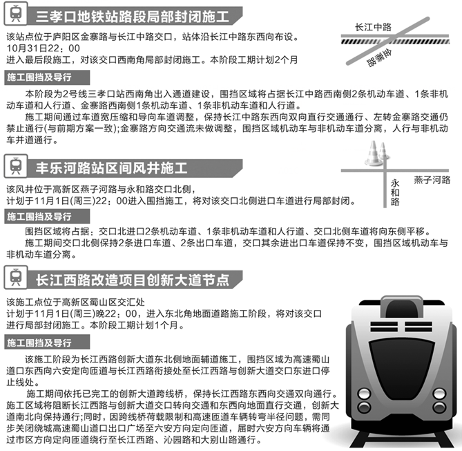合肥交警部門發(fā)布消息,10月31日22:00起,合肥金寨路與長江中路交口西南角局部封閉施工;11月1日晚,合肥燕子河路永和路交口北側、長江西路改造項目創(chuàng)新大道節(jié)點也將開始封閉施工。