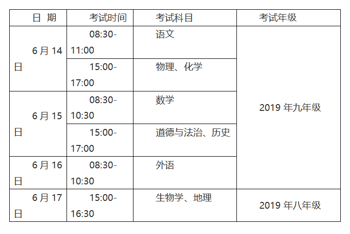 2019年是安徽省初中學(xué)業(yè)水平考試改革前與改革后考試方式并行的一年,由全省統(tǒng)一命題、統(tǒng)一制卷、統(tǒng)一時間,各市統(tǒng)一組織實施。3月13日,安徽省教育廳下發(fā)通知,今年初中學(xué)業(yè)水平考試省統(tǒng)一考試科目具體時間安排已經(jīng)出爐,原定6月16日下午舉行的八年級生物學(xué)、地理學(xué)科學(xué)業(yè)水平考試統(tǒng)一調(diào)整為6月17日下午舉行。