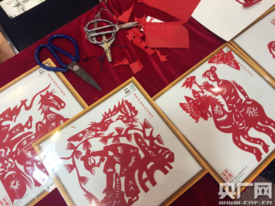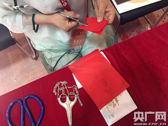 。ǜ逢(yáng)程氏剪紙第三代傳人程娟娟在展廳展示民間剪紙藝術(shù))