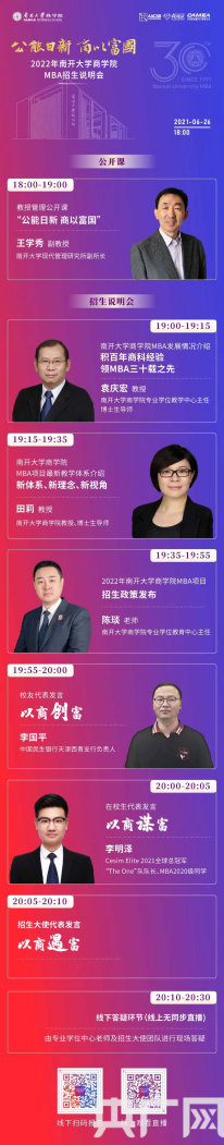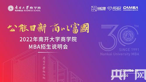 央廣網(wǎng)北京6月23日消息(記者 陳祥銳)2022年南開(kāi)大學(xué)商學(xué)院MBA項(xiàng)目招生說(shuō)明會(huì)將于6月26日18:00開(kāi)啟。