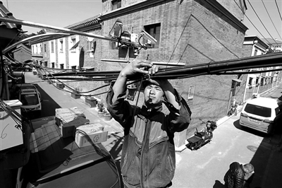 走進(jìn)西總布胡同,抬頭望去,粗細(xì)不一、長(zhǎng)短各異的架空線如同蛛網(wǎng)般橫七豎八地覆蓋在胡同上空。“這些密密麻麻的線,有網(wǎng)線、有線電視線、電話線、電力的線,還有路燈線。”東城區(qū)城管委市政科孫哲說(shuō)。