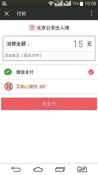 10月20日起,內(nèi)地居民在全市公安機(jī)關(guān)各出入境接待場(chǎng)所,即市公安局出入境管理局接待大廳、16個(gè)分局的出入境接待大廳,以及62個(gè)出入境證件派出所受理點(diǎn)的人工服務(wù)窗口辦理出入境業(yè)務(wù)時(shí),辦證回執(zhí)單上將打印有二維碼。申請(qǐng)人使用手機(jī)微信掃描二維碼后即可進(jìn)入支付界面(付款對(duì)象為北京公安出入境),按照微信支付流程操作即可完成繳費(fèi)。