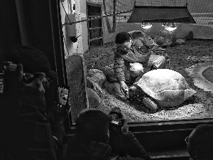食蟻獸沒有絨毛,看似挺長的尾巴其實都是硬刺,專用來遮擋毒辣的陽光,因此他們最怕冷。食蟻獸的房間里既有暖氣又有浴霸,10歲的南南吃完早餐正在散步,一副愜意的樣子。象龜?shù)募冶仁诚伀F家多了暖風設(shè)備,一進獸舍恍若來到熱風襲面的赤道地區(qū)(見圖)。飼養(yǎng)員說,這里的三頭象龜都來自塞舌爾,浴霸不僅供暖用,更起到“回家”的作用,“這些大家伙喜歡太陽的強光,浴霸的光對他們來說,就是太陽光,離不了。”豹紋守宮和西非擬蜥這些爬行動物個頭都小巧,飼養(yǎng)員干脆把電線埋在“石頭”里,制作成發(fā)熱石,這些小家伙則更愿意趴在上面伸懶腰。