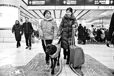 從北京南站站臺(tái)到地下停車場的路上,黑萌萌要經(jīng)過電梯,繞過障礙物。第一次看到火車站川流不息的人群,黑萌萌剛開始有些無所適從,在南站潤秋服務(wù)組張潤秋的幫助和陳燕不斷發(fā)出的“good good”的鼓勵(lì)下,它很快適應(yīng)了新環(huán)境。張潤秋說,以前珍妮和陳燕來北京南站乘坐高鐵,服務(wù)組的工作人員都會(huì)接送,和她們成了好朋友,現(xiàn)在黑萌萌接班,相信它也一定能當(dāng)好陳燕的眼睛。