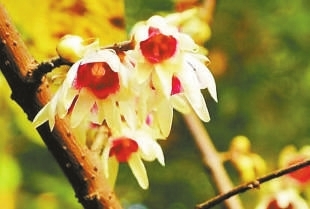 現場:沿著蕙芳園蜿蜒的竹林小徑,穿過一座樸實無華的柴門,地形突然起伏,青松樹下幾枝金黃閃現眼前,20余株馨香素雅的蠟梅正在盛開。